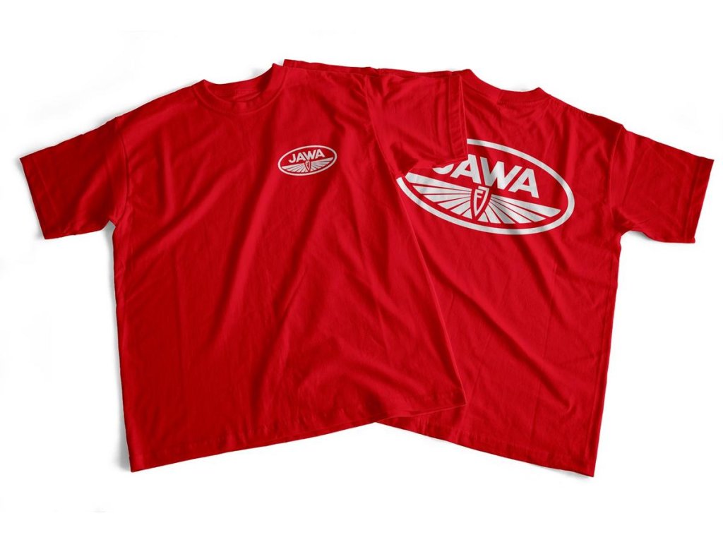 Červené bavlněné tričko s potiskem loga JAWA František Janeček (FJ) na srdci na zádech. Logo JAWA je na tričku natisknuto semišovým „chlupatým“ termotransferovým flock potiskem.