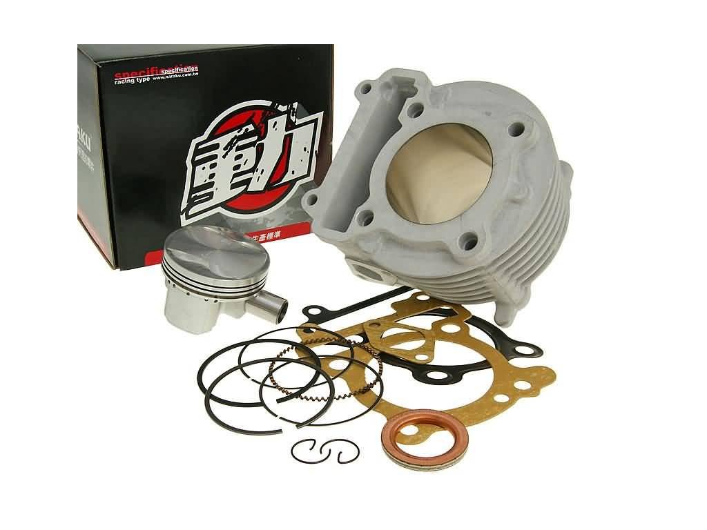 Válec Naraku Ceramic 155ccm, kovaný píst, Yamaha Cygnus / BW`s 5ML 4V 125 - Válec od Naraku s obsahem 155ccm a vrtáním 58,5 mm pro motory Yamaha 5ML. Nárust výkonu je znatelný oproti 125ccm. Výhodou je kovaný píst, který je z lepších materiálů a je odolnější a proto lze nastavit i větší kompresi. Díky venkovnímu keramickému povrchu válce je zajištěn ještě lepší odvod tepla. Sada se dodává bez hlavy a je nutné použít originální.Doplňkové parametry