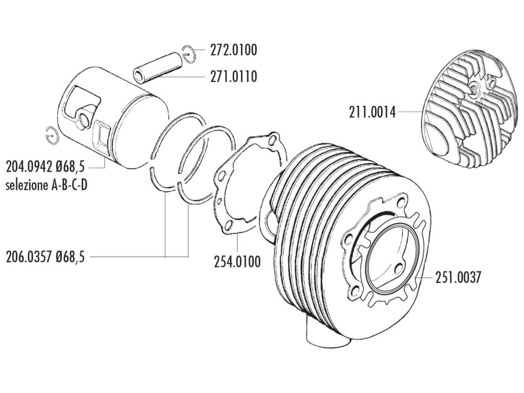 Pístní sada Polini v top kvalitě pro válce 210 a 221ccm. Průměr pístu je 68,5mm (A), tato pístní sada je vhodná pro Vespu 200 PE, PX. V sadě je píst, pístní kroužky, pístní čep...