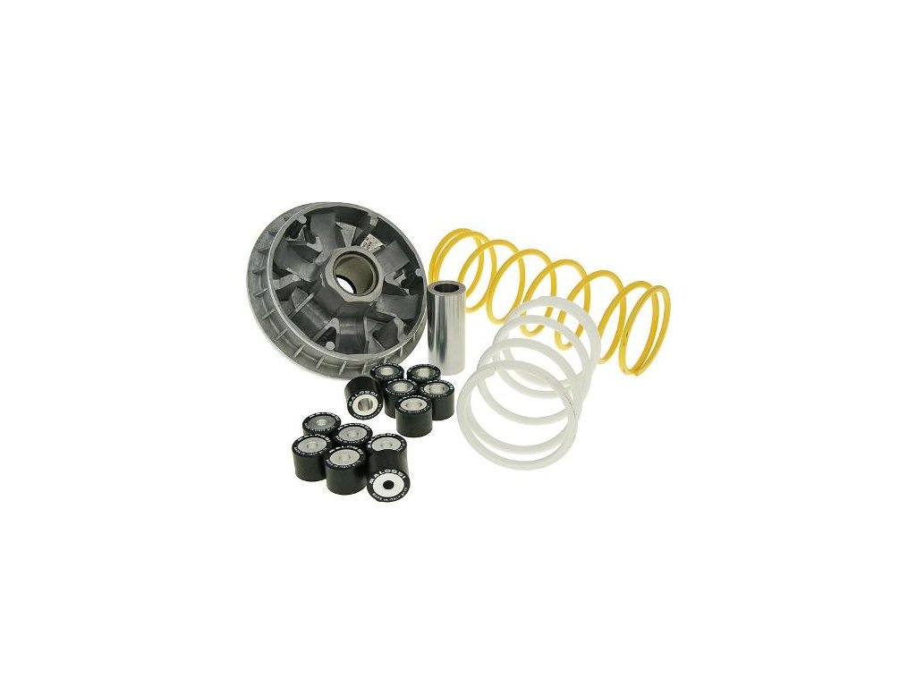 Variátor Malossi Multivar, Honda Pantheon 2T - Variátor Malossi Multivar je vhodný pro skútry, jak seriové, tak upravené. Poskytne plynulý přenos výkonu a kroutícího momentu na zadní řemenici. Osvědčený výrobek od Malossi, zaručuje vysokou kvalitu a dlouhou životnost. V sadě je variátor, dvě sady válečků 23x18 13g a 15g a dvě kontrastní pružiny. Bílá kontrastní pružina pasuje na hondy, které mají řemenici označenou písmeny GF a žlutá kontrastní pružina je pro označení FG. Pro řemenici s označením GF jsou určeny válečky 23x18 13g a pro FG 23x18 15g.Doplňkové parametry