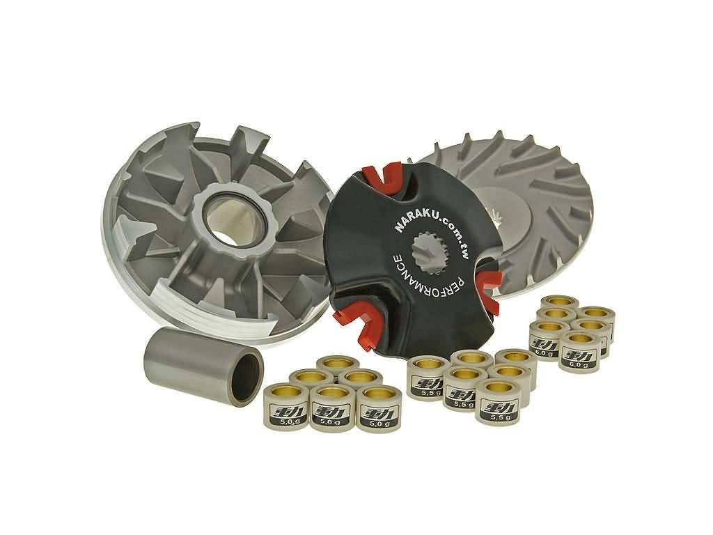 Variátor NARAKU HS-CNC, CPI 16 mm - Tento vysoce výkonný variátor od firmy Naraku pro motory Minarelli s 16mm klikovou hřídel. Variátor je dodáván s polořemenicí. Variátor je vyroben pomocí CNC strojů což zaručuje vysokou přesnost zpracování. Variátor je nejlepší použít ve spojení se 70 ccm válcem a odpovídajícím výfukem.