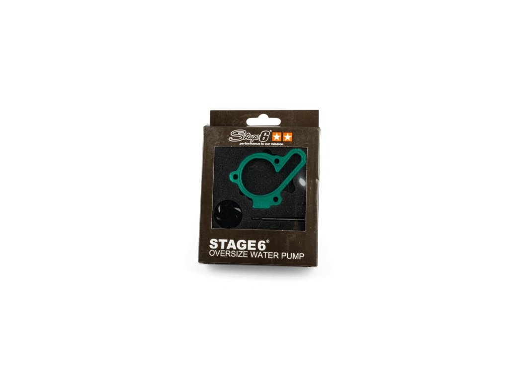 Vypusťte chladicí kapalinu, demontujte víko originální vodní pumpy a oběžné kolo. Zkontrolujte stav těsnění a případně jej vyměňte. Vložte hřídel vodní pumpy s oběžným kolem Stage6, nasaďte základní desku víka s O-kroužky a namontujte víko vodní pumpy (originální nebo Stage6). Připojte hadice chlazení Derbi a odvzdušněte chladicí systém. Doporučuje se nahradit starou chladicí kapalinu novou.