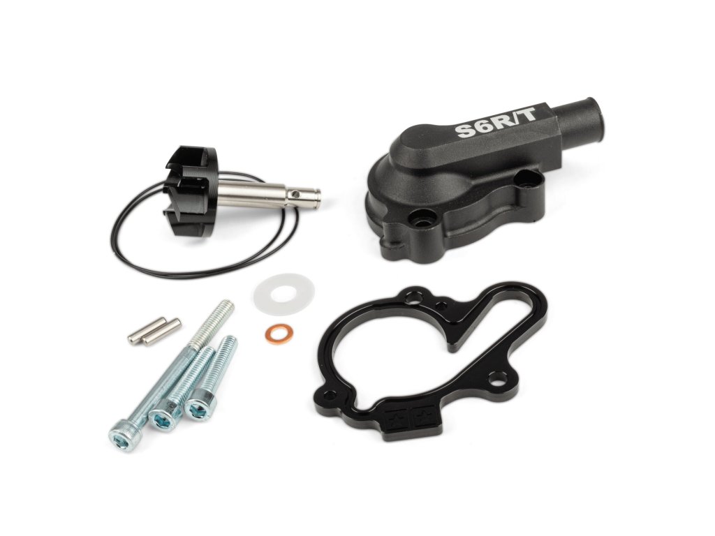 Sada obsahuje barevně eloxovaný spacer pro víčko, hnací hřídel, oversize oběžné kolo, CNC víčko vodní pumpy, O-kroužky a šrouby. Základní deska pro víčko je dostupná v různých barvách pro výkonové i vizuální vylepšení stroje.