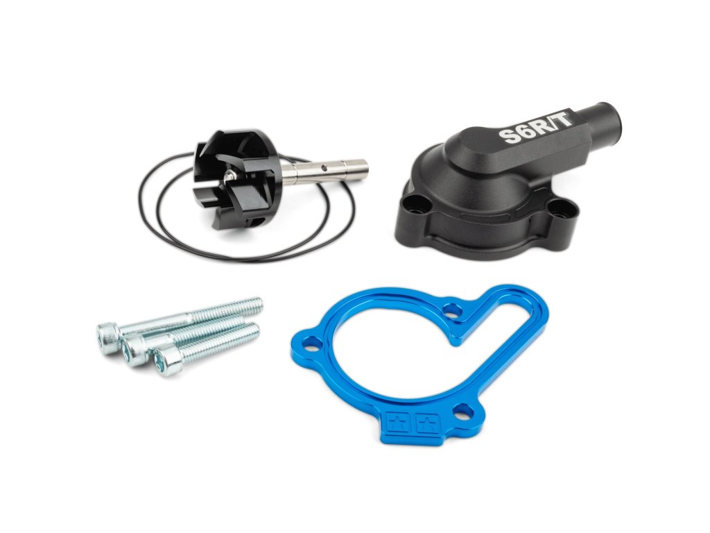 Vypusťte chladicí kapalinu, demontujte originální víko vodní pumpy a oběžné kolo. Zkontrolujte stav těsnění a v případě potřeby je vyměňte. Vložte hřídel s oběžným kolem Stage6, nasaďte základní desku víka s O‑kroužky a poté víko Stage6 R/T. Připojte hadice, odvzdušněte chladicí systém a doplňte novou chladicí kapalinu.
