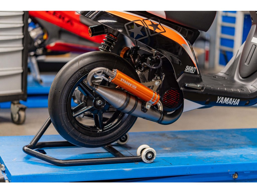 Výfuková soustava Stage6 Pro Replica MKII s oranžovým koncovým tlumičem pro Peugeot stehend. Vhodné pro skútry Peugeot Speedfight 1 a 2, TKR a další.