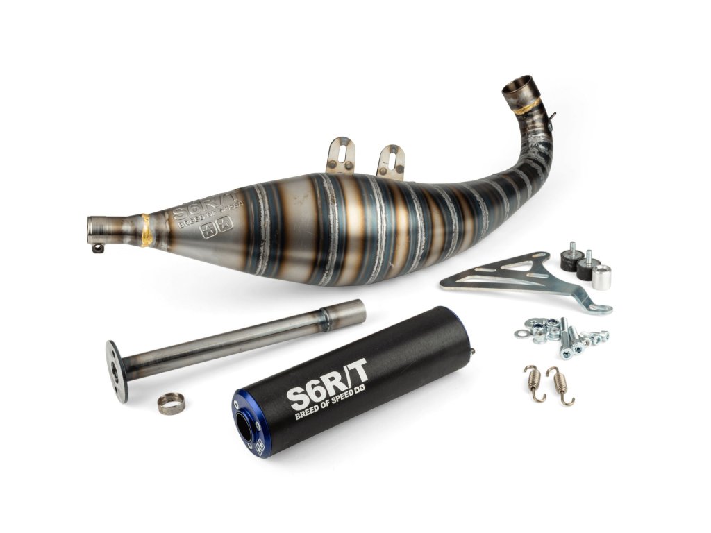 Závodní výfuk Stage6 R/T pro Derbi a příbuzné modely. Ručně svařovaný, nelakovaný. Zaměřen na maximální výkon ve vysokých otáčkách. Bez tlumiče.