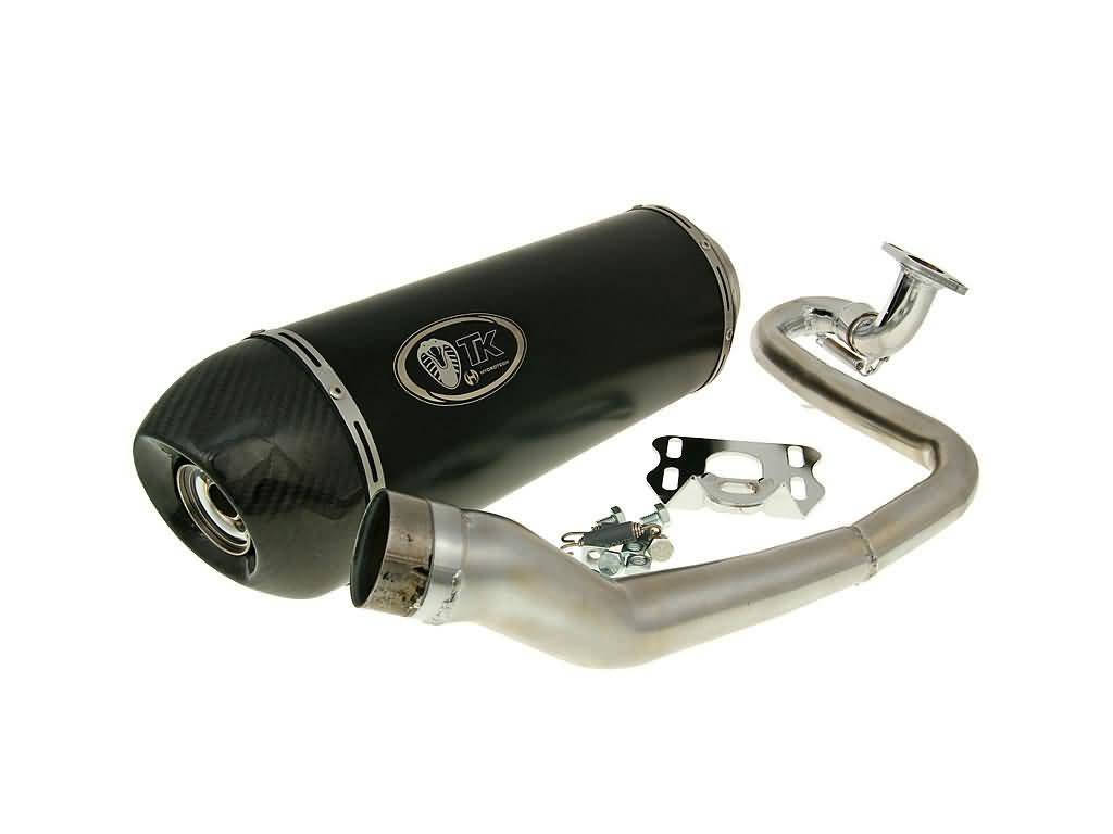 Výfuk Turbokit Gmax Carbon, GY6 125/150ccm 152QMI - Kvalitní výfukový systém od Španělského výrobce Turbokit. Jedná se o výfuk z nerez / hliníkové konstrukce, která dá Vašemu skútru ten správný zvuk a vyšší výkon. Výfuk má pěkné designové zpracování a carbonové víčko dodá koncovce ten správný vzhled. Výfuk je samozřejmě homologovaný. Koncovka je opatřena DB-killerem(tlumičem zvuku), který lze jednoduše odstranit odstraněním ségrovky. Odstraněním DB Killeru docílíte pravého zvuku výfuku. Před zakoupením porovnejte svod výfuku originálu s obrázkem.
