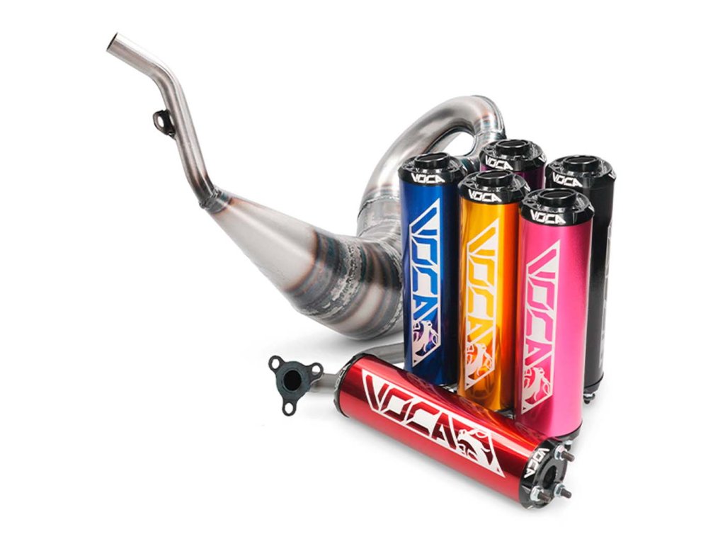 Nahoře vedená MX‑style výfuková soustava od Voca Racing bez koncového tlumiče pro 50 ccm a 70 ccm sportovní nebo midrace válce.