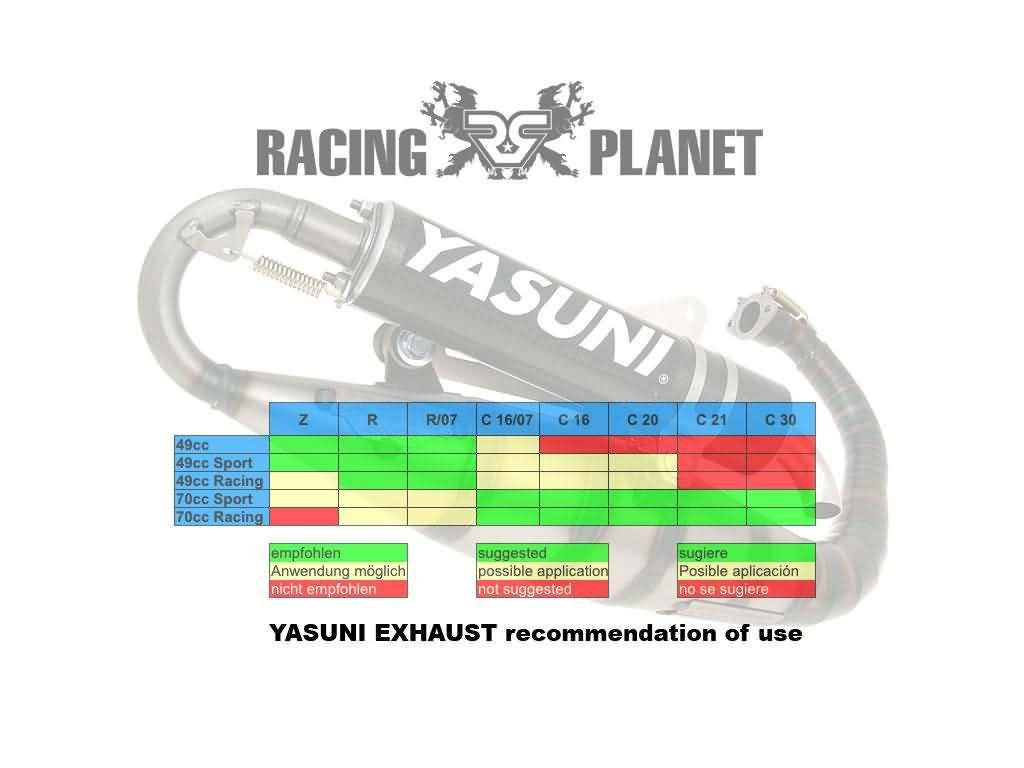 Větší brácha Yasuni Z s větším rezonančním prostorem. Hodí se ke všem seriovým a sportovním válcům nebude mít problém ani s lepšími hliníkovými válci. Výkon porovnatelný s výfuky Stage6 PRO Replica nebo Hebo Performer. Samozejmostí je vysoce kvalitní žáruvzdorný lak a perfektní zpracování. Omezení kvuli homologaci je umístěno v koleni výfuku a koncovce. Výfuk je dostupný se čtyřma různýma koncovkama a to s hliníkovou, černou, karbonovou nebo kevlarovou.Doplňkové parametry