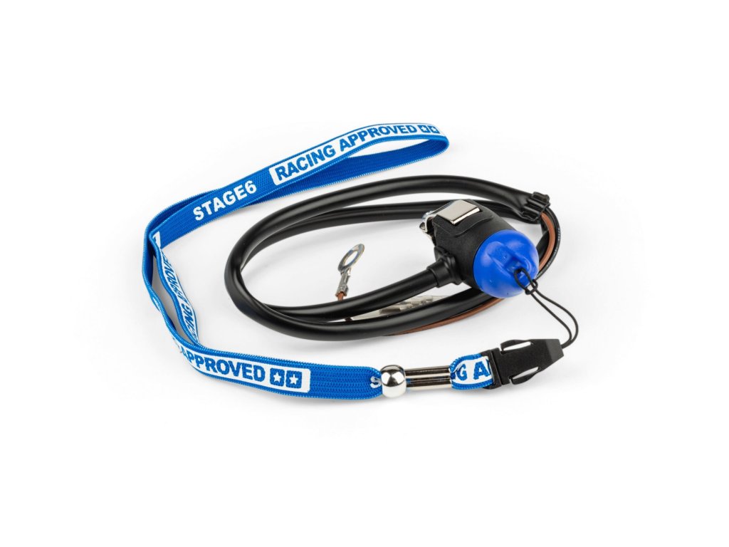 Stage6 Killswitch je k dispozici v novém designu s barevným páskem s logem Stage6 Racing Approved a ladící magnetickou čepičkou. Model Stage6 Killswitch MK2 je praktické závodní příslušenství spojující funkčnost a styl. Nouzový vypínač byl vyvinut pro závodní použití, ale hodí se i na silnici. Připevňuje se objímkou přímo na řídítka (22 mm nebo 28,6 mm). Odnímatelný elastický pásek lze pomocí posuvného kroužku přizpůsobit na zápěstí. V případě pádu nebo pokusu o krádež se magnet automaticky uvolní a motor se okamžitě zastaví. Součástí je kompletní kabeláž pro připojení k originálním i vnitřním rotorovým zapalováním. Hnědý kabel (60 cm) slouží k uzemnění (M6), černý k zapalování (samice).