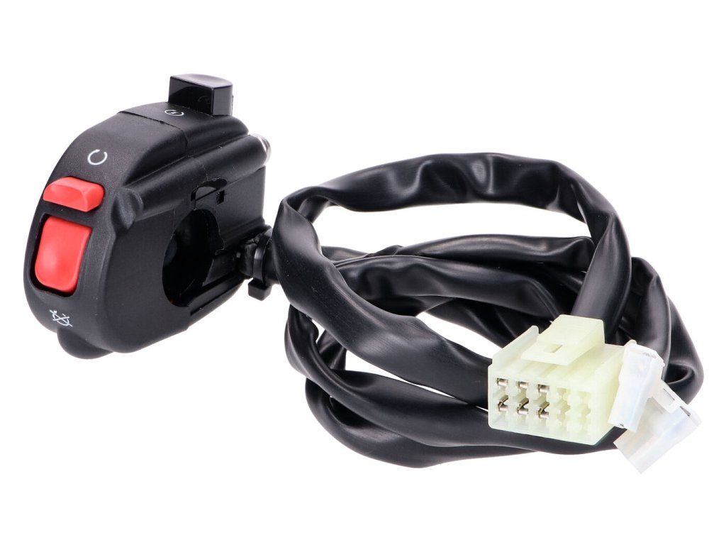 Černý spínač s tlačítkem startéru a přerušením zapalování / Kill Switch z řady 5D od Domino. Včetně kabelu – 710 mm dlouhý – a konektoru.