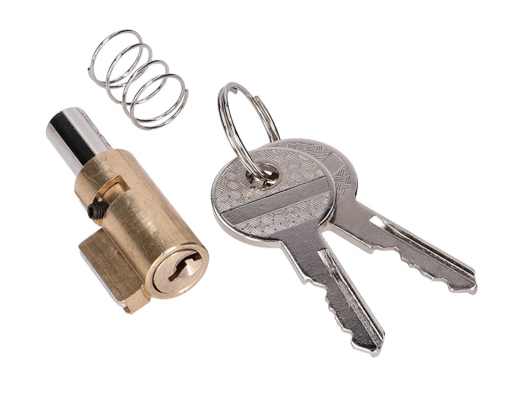 Náhradní zámek řízení se 2 klíči, je vhodný pro mopedy Puch Maxi, MS, VS, DS, MC, VZ, Monza, Jet a mnoho dalších mopedů výrobců Piaggio, Sachs, Tomos a Kreidler. Průměr mosazného válečku: 12 mm, průměr pojistné tyčky: 8 mm, celková délka: 41mm, délka mosazného válečku: 26,3 mm. OEM číslo: 330.1.20.052.9.