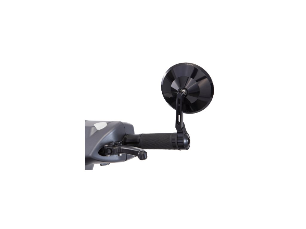 Stylové zrcátko na koncovku řídítek MONTANA 2, je na levou nebo pravou stranu řídítek. Zrcátko je vhodné na skútry Vespa ET, LX, LXV, S, GTS, GTS Super, GTV, GT 60, GT a GT L. Zrcátko má černou barvu a kulatý tvar. Zrcátko je vyrobené z kvalitního hliníku. Průměr zrcátka: 102mm, délka ramínka: 120mm. Pokud nemáte závaží na konci řídítek, nebo máte kónusovou koncovku, je třeba zakoupit montážní sadu pro toto zrcátko (MV502950). Cena za jeden kus.